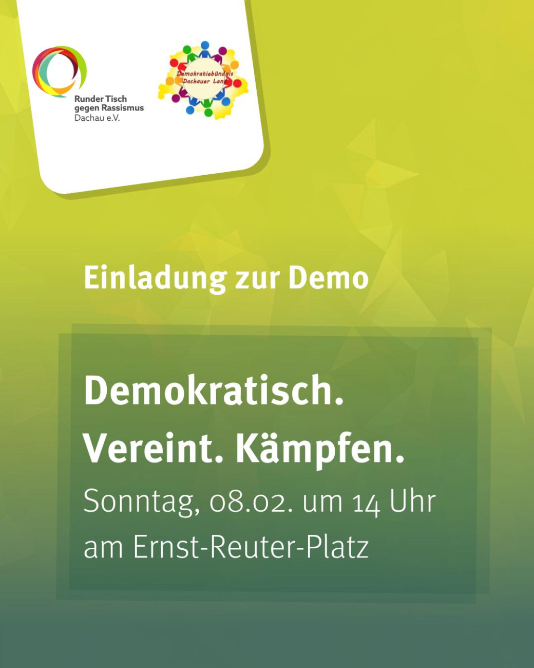 Nach dem großen Zuspruch der Demos für Demokratie in den letzten Jahren ruft der Runde Tisch gegen Rassismus Dachau e.V. erneut auf zusammenzukommen und Position und Haltung zu zeigen. Diesmal in Kooperation mit dem Demokratiebündnis Dachauer Land unter dem Motto: